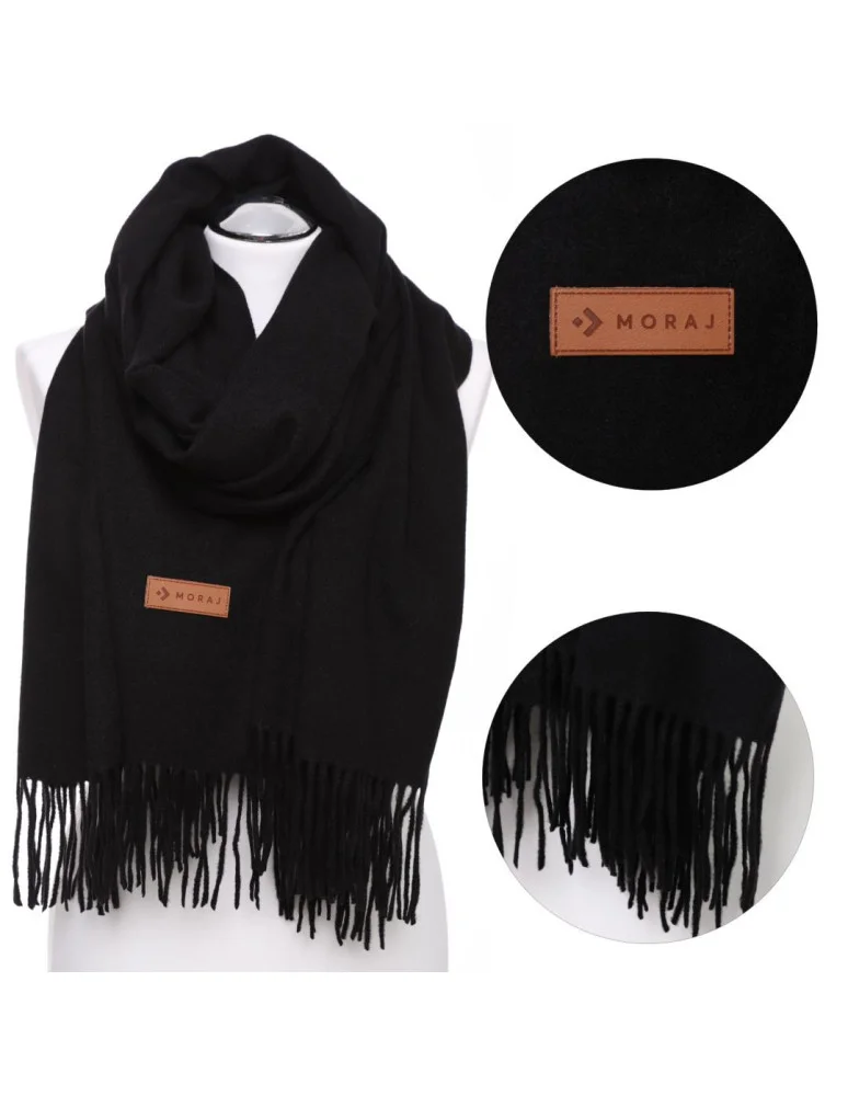 Czarny szal damski ciepły z frędzlami na jesień i zimę CZARNY