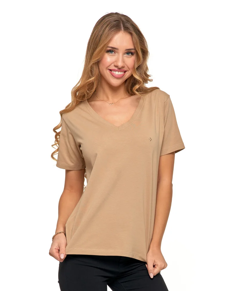 Koszulka damska bawełna Premium T-shirt dekolt w serek BEŻOWY
