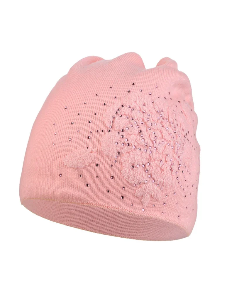 Czapka damska z ozdobną różą z domieszką wełny RÓŻOWY
