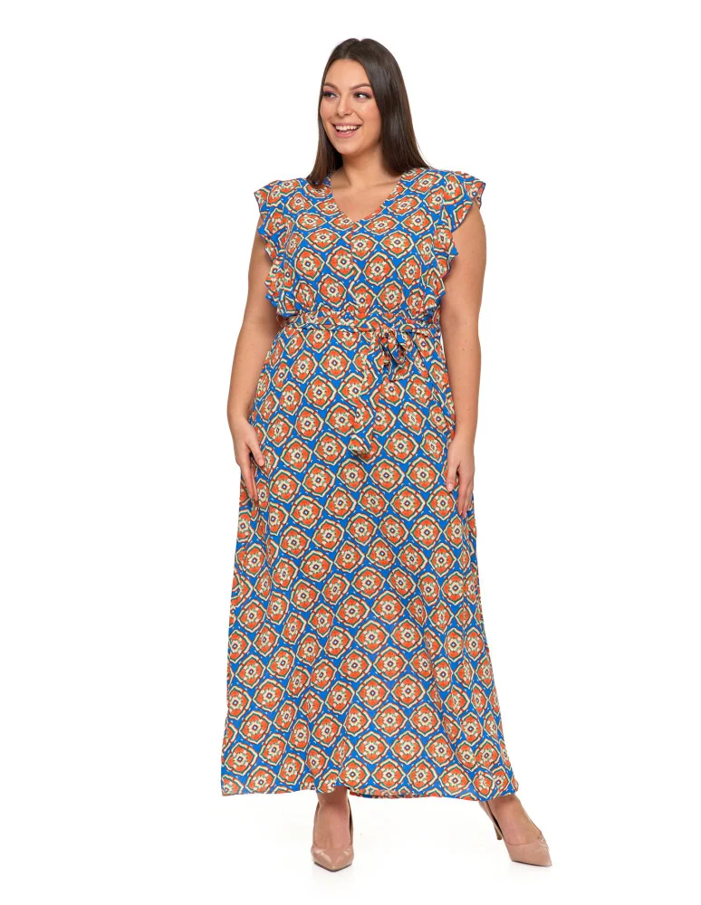 Sukienka damska maxi z motylkowym rękawem w orientalny wzór NIEBIESKI