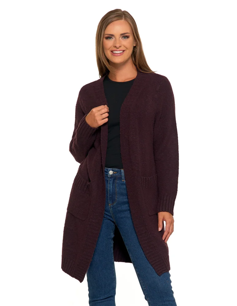 Kardigan damski długi sweter z kieszeniami BRĄZOWY