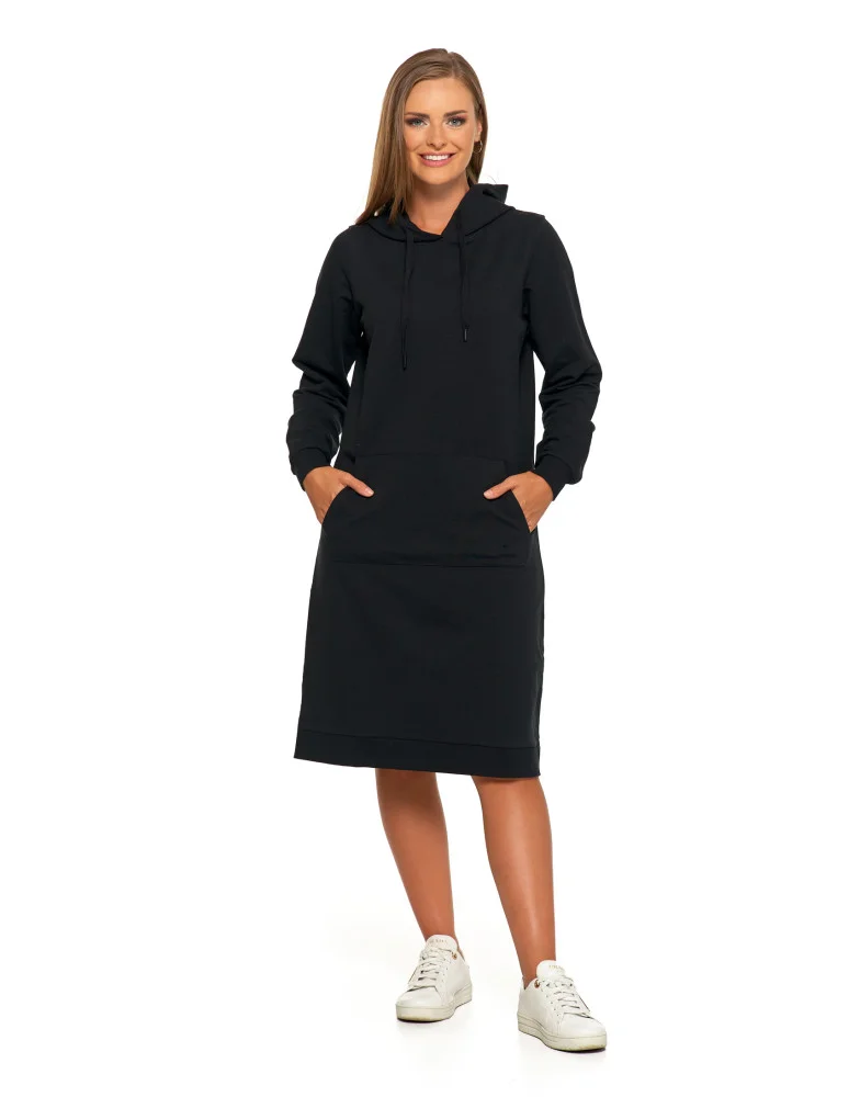Sukienka dresowa midi z kapturem i bocznymi rozcięciami CZARNY