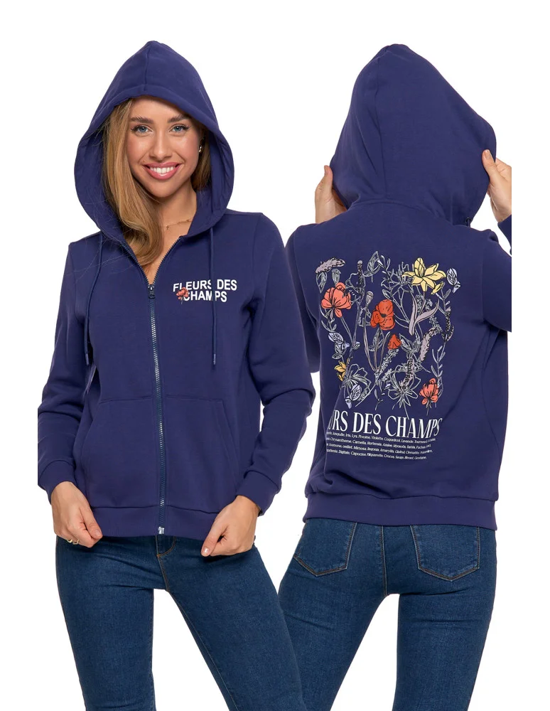 Ocieplana bluza damska rozpinana bawełniana motyw kwiatów GRANATOWY