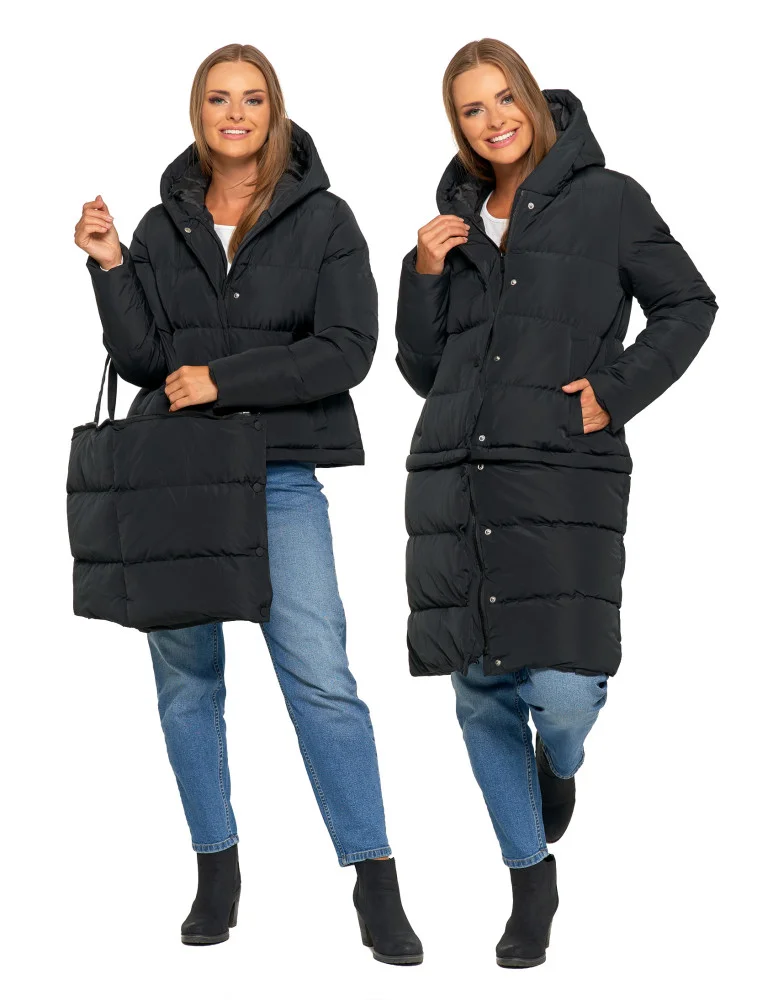 Długa kurtka damska puchowa z wypełnieniem syntetycznym 2w1 CZARNY