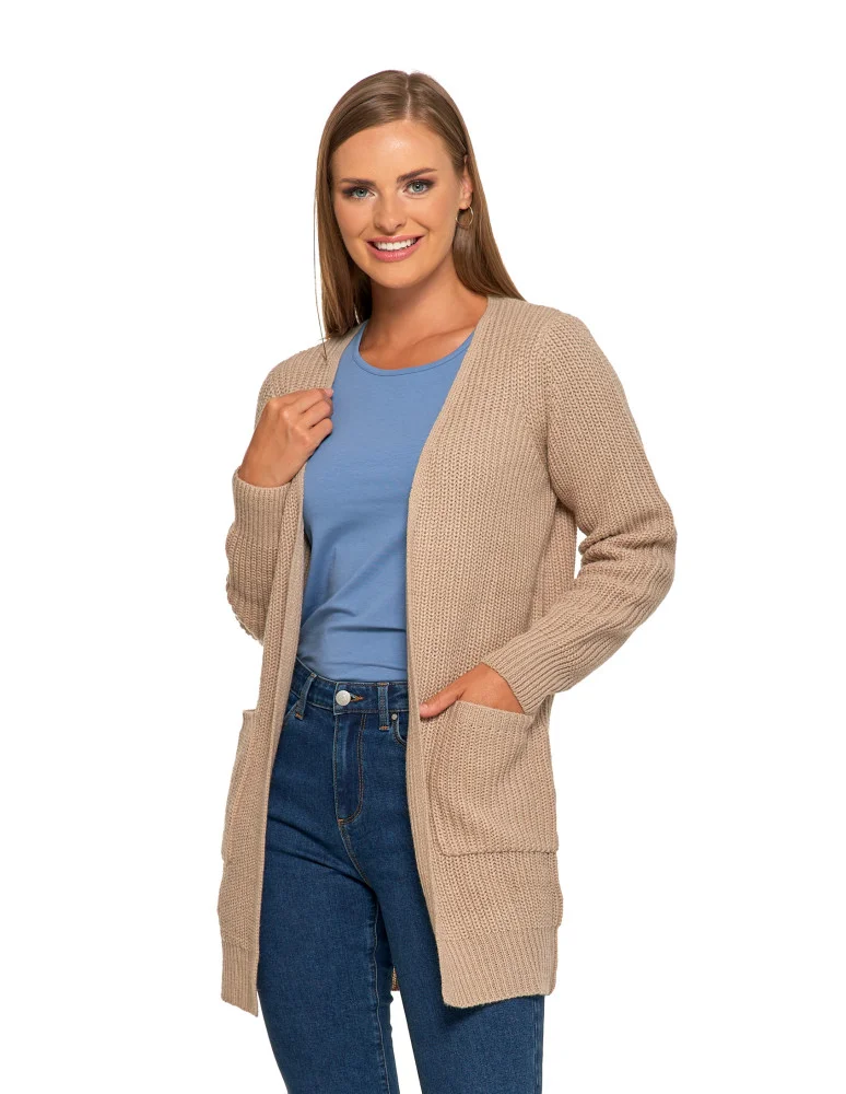 Damski dzianinowy kardigan z kieszeniami BEŻOWY