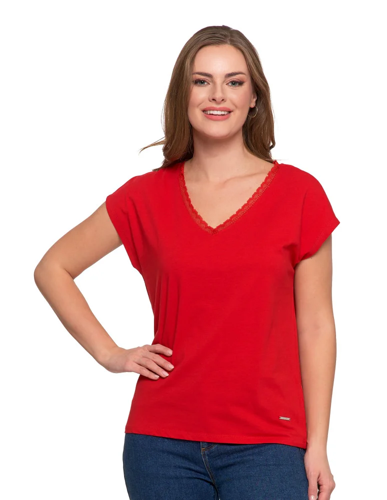 Bluzka damska bawełniana z koronkowym dekoltem CZERWONY