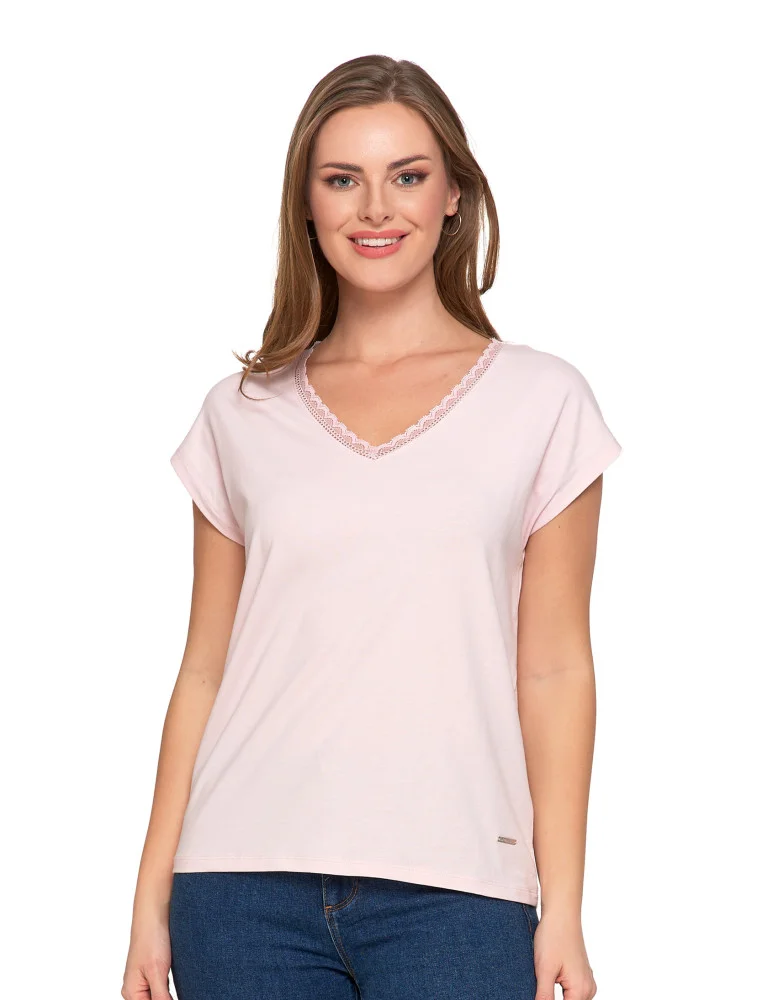 Bluzka damska bawełniana z koronkowym dekoltem RÓŻOWY