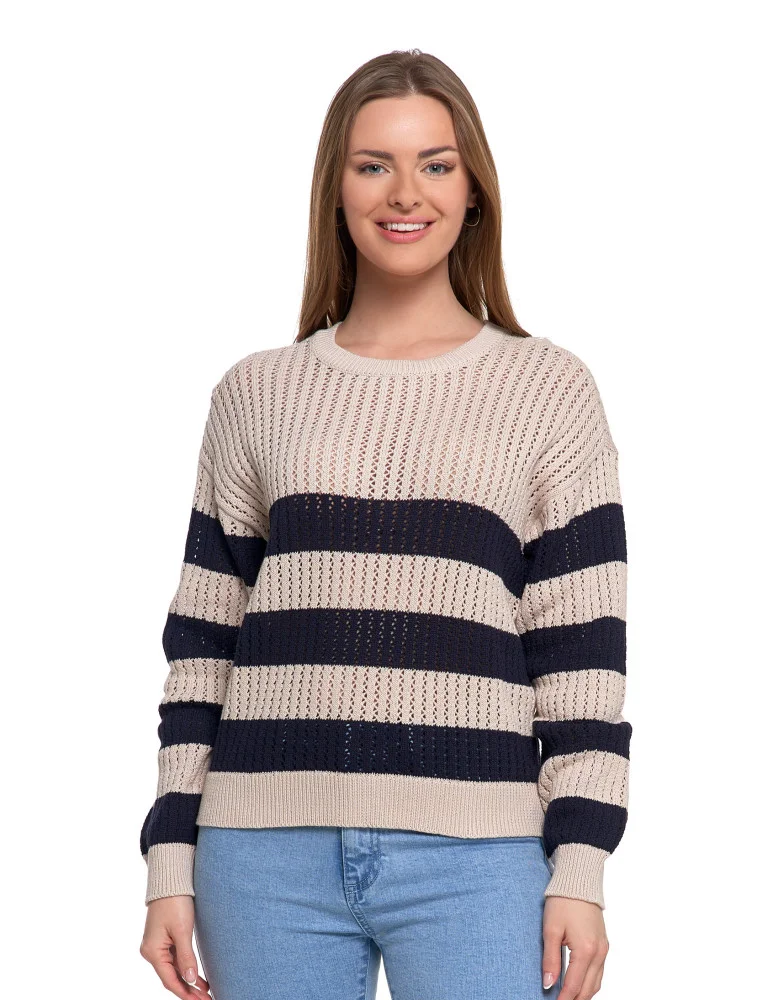 Sweter damski ażurowy bawełniany w paski BEŻOWY
