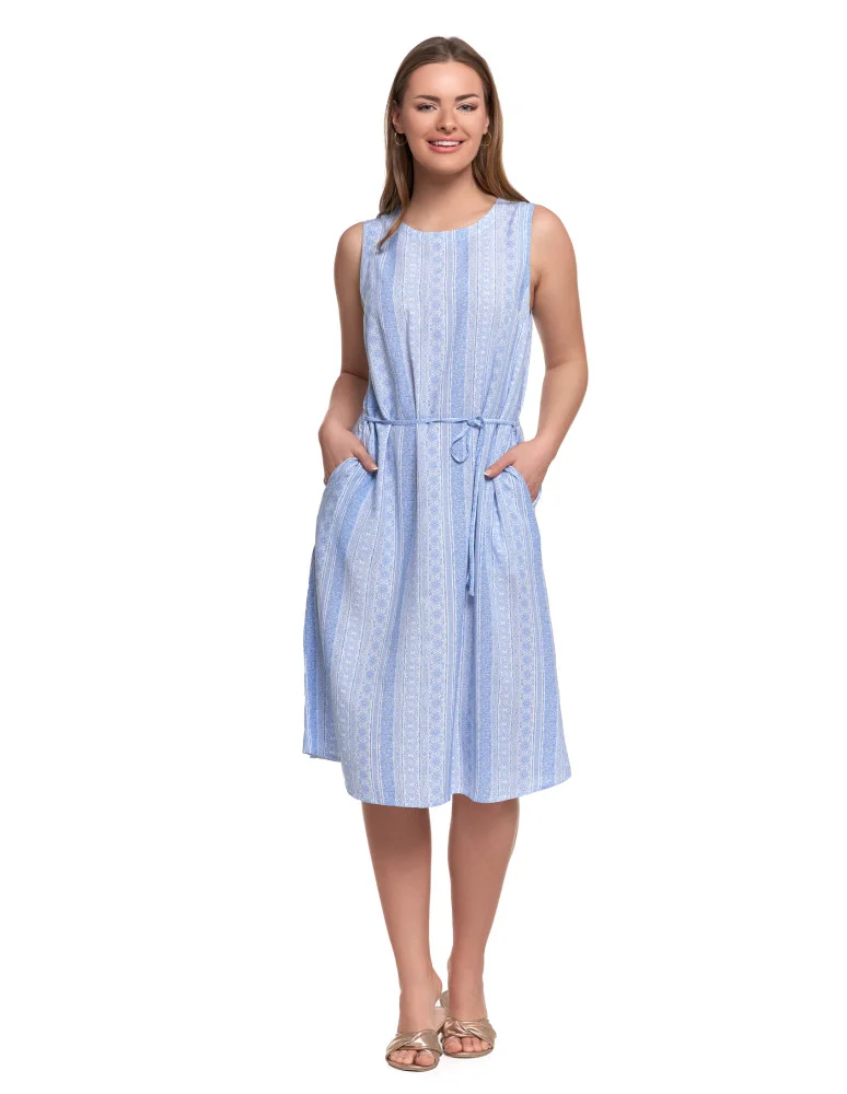 Sukienka damska wiskozowa z wiązaniem w talii i kieszeniami NIEBIESKI