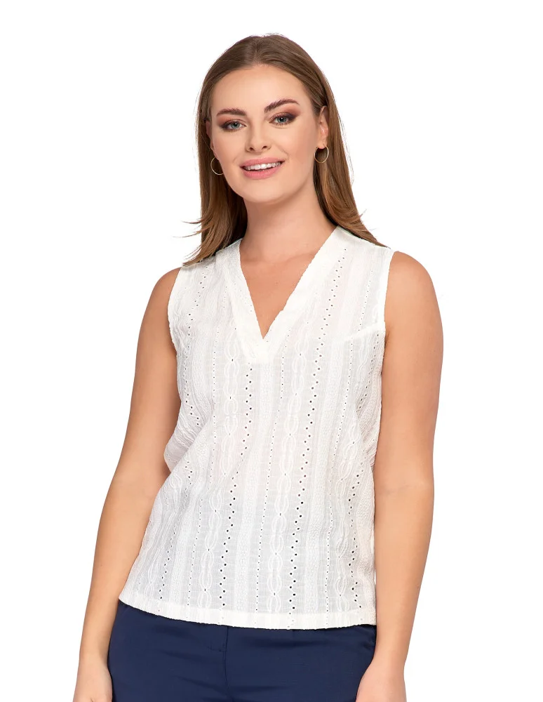 Ażurowa bluzka damska bez rękawów z dekoltem w serek BIAŁY