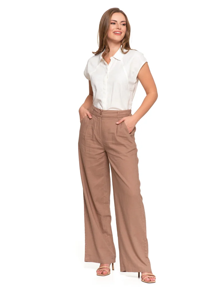 Damskie szerokie spodnie lniane z wysokim stanem BEŻOWY